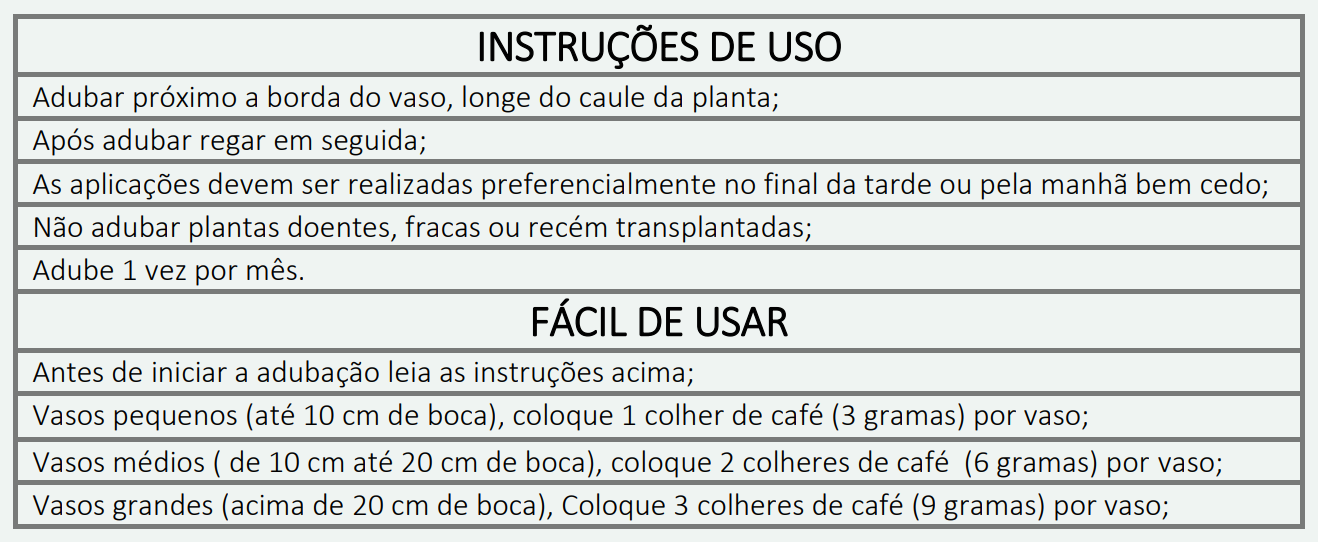 Esta combinação com micronutrientes atendem as plantas de forma equilibrada, mantendo as folhas e caules saudáveis e o bom desenvolvimento de raízes.
