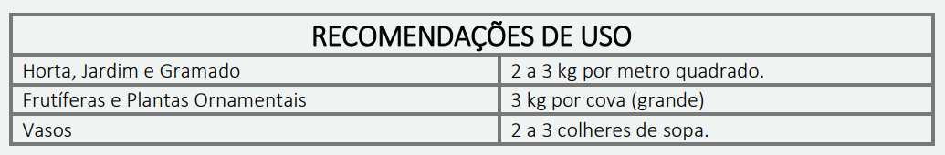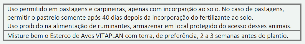 Uso permitido em pastagens e carpineiras, apenas com incorparção ao solo. No caso de pastagens, permitir o pastreio somente após 40 dias depois da incorporação do fertilizante ao solo.