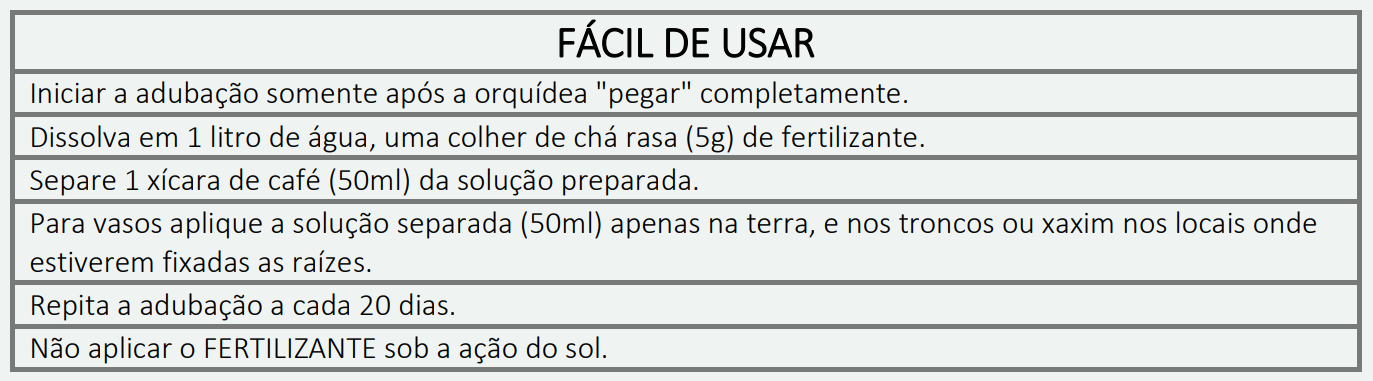 Rico em nutrientes, de uso prático e fácil, ajudando a manter suas ORQUÍDEAS, sempre saudáveis, fortes e bonitas.