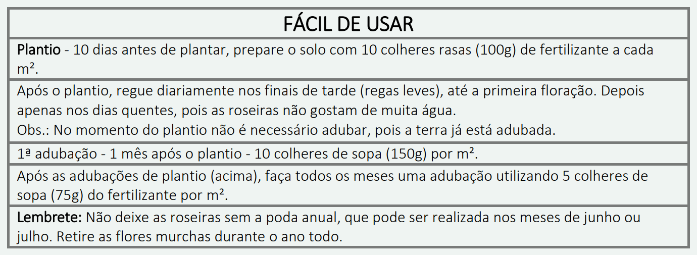 Elaborado especialmente para cultura de ROSAS, proporcionando uma floração bonita e abundante.