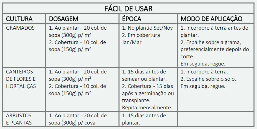Com esta combinação de um fertilizante orgânico com um mineral, consegue-se neutralizar corretamente o pH do solo e também fornecer às plantas os principais nutrientes para um melhor desenvolvimento das mesmas.