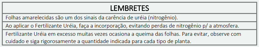 Fertilizante rico em Nitrogênio de ação verdejante que acelera o processo de crescimento, dando vigor às plantas. Utilizado para cobertura, pois acelera o crescimento da planta e proporciona resultado rápido. DICA: Sempre que for aplicado a ureia, regar logo em seguida e aplicar longe do caule da planta.