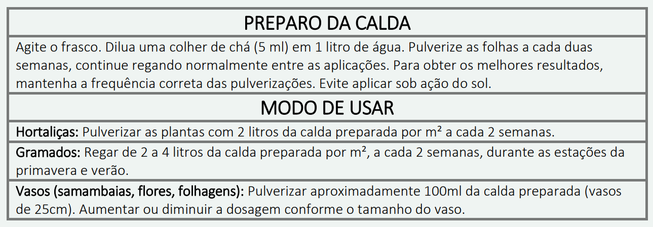 É um fertilizante líquido com uma quantidade significativa de Nitrogênio. Ideal para o cuidado regular com folhagens e plantas na fase de crescimento até a floração e para mantê-las mais verdes e bonitas.